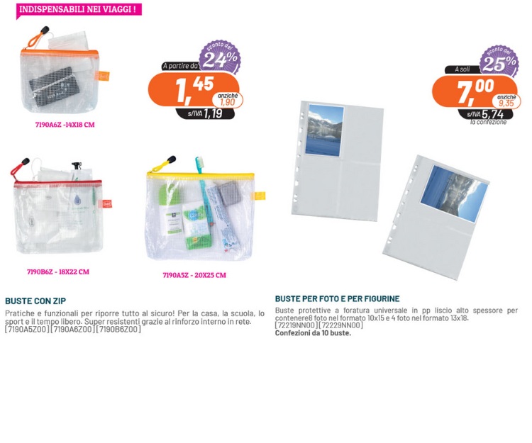 Dalle pratiche buste con zip per organizzare documenti e gadget tecnologici, alle buste per foto che custodiscono i tuoi ricordi più preziosi, fino ai caricabatterie e cavetti di ricarica che mantengono i tuoi dispositivi sempre operativi.